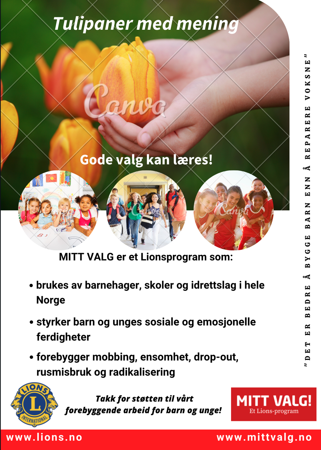 Motto for aksjonen er at «DET ER BEDRE Å BYGGE BARN ENN REPARERE VOKSNE». Din støtte er med på å finansiere Lions undervisningsprogram «MITT VALG» som er skreddersydd for å styrke barns sosiale kompetanse.
